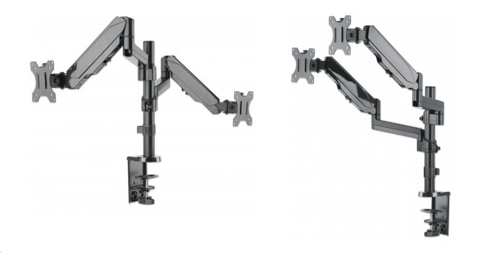 The Manhattan Universal Gas Spring Dual Monitor Mount securely supports two 17" to 32" TVs or monitors. Because it uses gas springs to hold your displays, the arms only need the lightest touch to move them to the best viewing angles for your purposes. The mount's high-quality aluminum and steel construction will provide years of reliable service. Ideal for installation on a large desk, the Manhattan Universal Gas Spring Dual Monitor Mount lets you take advantage of the extra range of movement so you can have more space to get work done.
