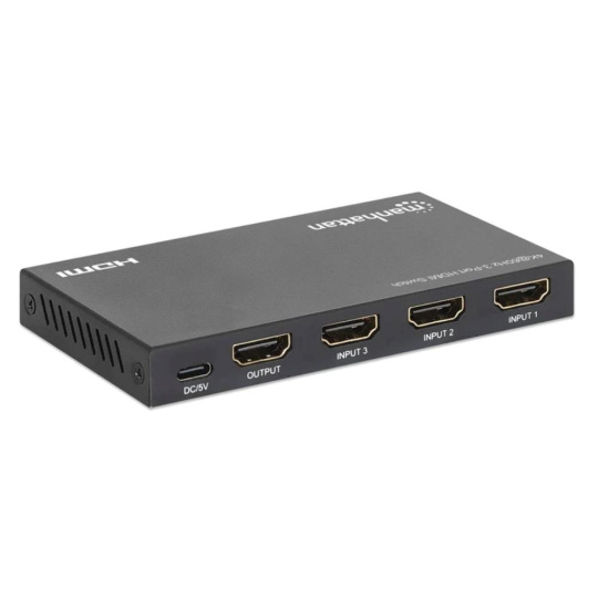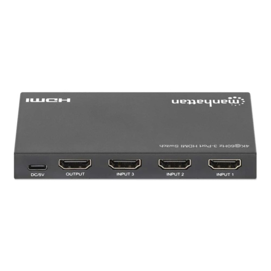 Manhattan 3portový HDMI přepínač umožňuje spolehlivé a pohodlné přepínání mezi třemi různými HDMI zdroji a jedním displejem. Podporuje rozlišení až Ultra-HD 4K při 60 Hz a nabízí automatické přepínání na právě aktivní zařízení, stejně jako manuální volbu pomocí IR dálkového ovladače nebo tlačítka. Díky šířce pásma až 18 Gb/s, chroma subsamplingu 4:4:4 a podpoře HDR, Dolby Vision a Dolby Atmos poskytuje živé barvy a ostrý kontrast bez degradace obrazu. Kompatibilní je napříč různými zařízeními – herní konzole, streamovací boxy, notebooky nebo Blu-ray přehrávače.