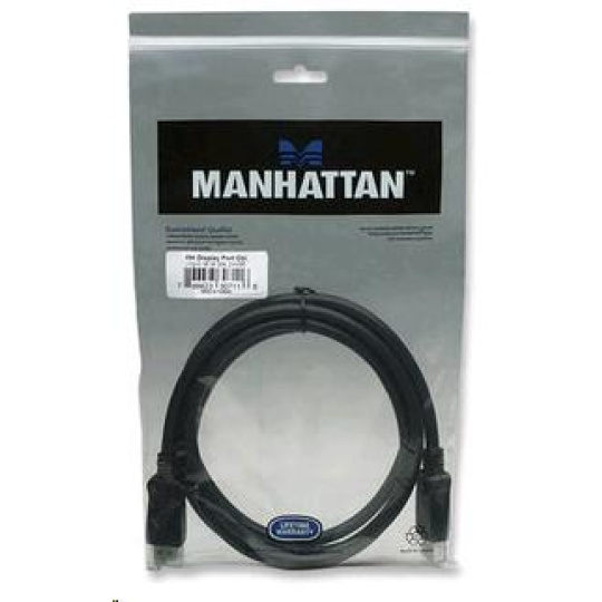 High-definition performance for personal computing MANHATTAN DisplayPort Cables provide a single-cable solution that delivers both high-definition digital audio and video signals between desktop and notebook computers and an output device. With 10.8 Gbps bandwidth (1080 Mbps), DeepColor and 24-bit, 8-channel uncompressed audio capability, the 20-pin connector is small, compact and ideal for use with DisplayPort-equipped computers, flat-panel displays, slim-profile devices and many consumer electronics including Blu-ray players and game consoles. Full foil and braided shielding, molded boots with strain relief, protective PVC jackets and gold-plated connections help MANHATTAN DisplayPort Cables provide maximum conductivity and clear, crisp signal transmissions with reduced EMI interference and distortion. •DisplayPort 20-pin male to DisplayPort 20-pin male latching connections •Delivers high-bandwidth, digital audio/visual signals from PC to display and other DisplayPort-enabled devices — up to 1080p resolution •Supports HDMI and DVI signal pass-through •Fully shielded to reduce EMI and other interference sources •Plug and Play for box-to-box applications •Molded PVC boot •Lifetime Warranty •Meets or exceeds existing DisplayPort 1.1 standards •Supports 10.8 Gbps data rate, 2560x1600 resolution (WQXGA) and HDCP •(2) DisplayPort 20-pin male with latches •Shielding: aluminum and Mylar braid •28 AWG Package Contents •DisplayPort Monitor Cable.