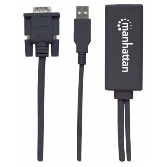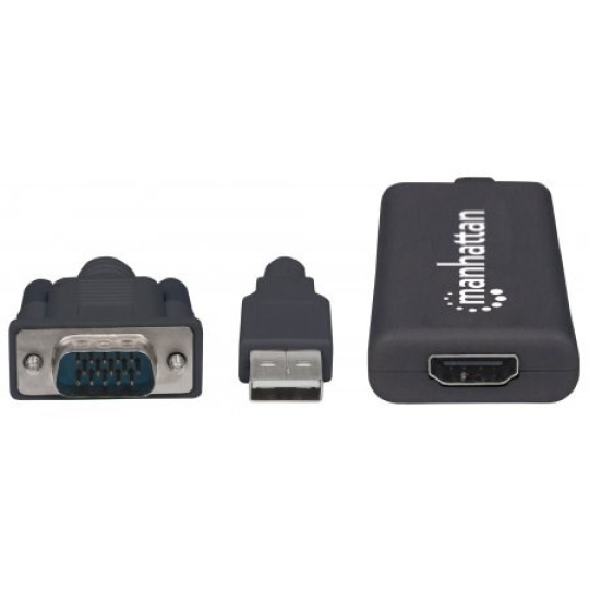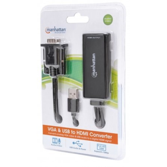 The Manhattan VGA and USB to HDMI Converter translates analog PC audio/video signals to HDMI format for compatible projectors, flat-panel HD displays, televisions and more. Advanced built-in circuitry lets you easily enjoy PC-based media on high-definition displays or TVs and maintains simultaneous A/V reception at the source PC. High bandwidth capability supports video resolutions up to 1920 x 1080 and 1080p@60Hz, serving beautifully for training, retail and trade-show purposes. Quick Plug and Play installation and Windows and Mac compatibility means the Manhattan VGA and USB to HDMI Converter makes it easy to deliver digital content stored on any desktop and notebook computers.