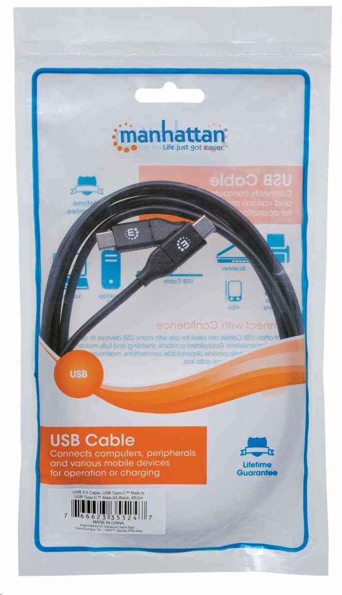 Manhattan USB-C kabel, USB 2.0, Male na Male, 480 Mbps, 5 A, 2m, černá
