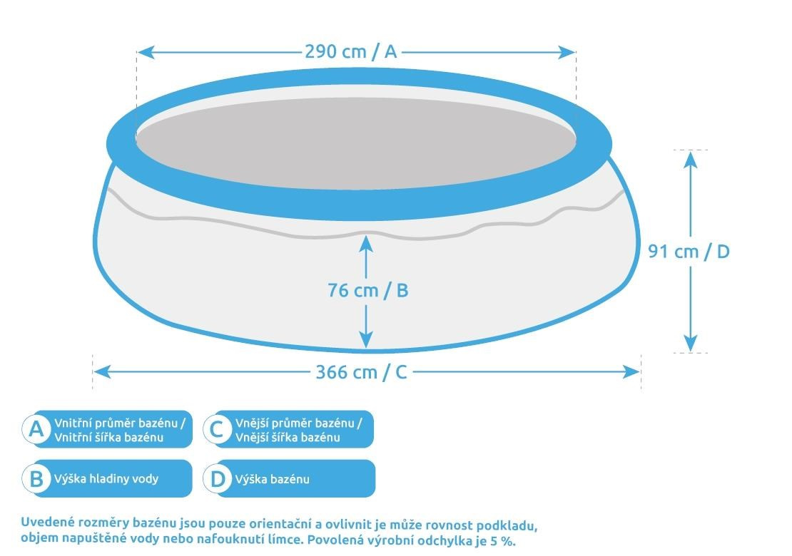 Uvedené rozměry bazénu jsou pouze orientační a ovlivnit je může rovnost podkladu, objem napuštěné vody nebo nafouknutí límce. Povolená výrobní odchylka je 5 %.