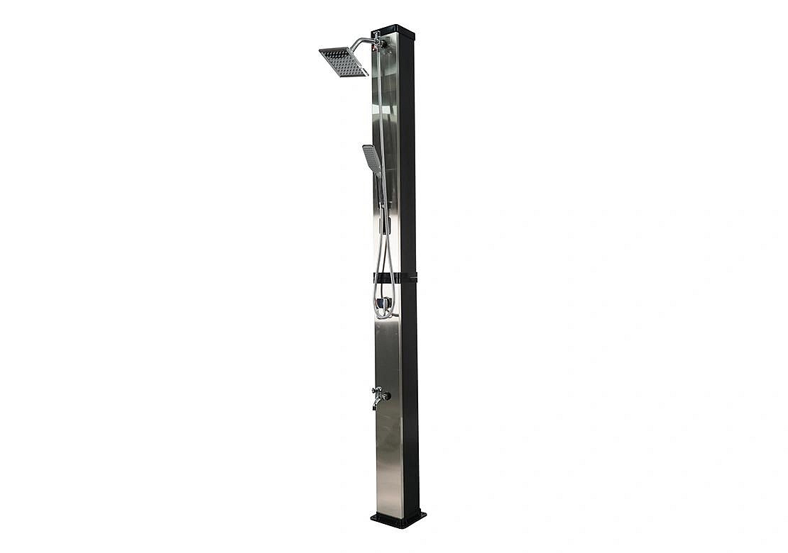 Zahradní dvoudílná a skladná sprcha DUO s objemem 40 l pro venkovní použití zajistí ohřev vody přiváděné ze zahradní hadice a tím perfektní pocit pohodlí při sprchování teplou nebo vlažnou vodou. Sprcha má pákovou baterii, ruční sprchu i kohoutek na oplach nohou. Ohřev vody zajišťuje sluneční záření a tělo sprchy, které funguje jako solární kolektor. Pro sprchování musí být zahradní sprcha stále napojena na vodovodní řad. Není-li napojena, nelze se sprchovat. Sprcha se kotví pomocí 4 šroubů (nejsou součástí balení) pevně k zemi, čímž je zajištěna její perfektní stabilita.