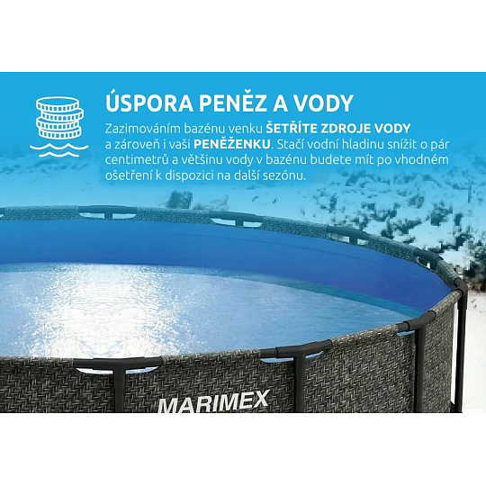 Další předností je, že u bazénu Marimex Florida si můžete vybrat, zda bazén na zimu vypustíte, složíte a uvolníte zahradu pro jiné aktivity, nebo ho zazimujete a ponecháte venku. Tím, že ho necháte na zahradě i mimo koupací sezónu, ušetříte čas, peníze za vodu, a hlavně i samotnou vodu. Při zazimování venku v bazénu zůstane více než 80 % vody, kterou v další sezóně opakovaně využijete. Jedná se o ekologické řešení zazimování bazénu.