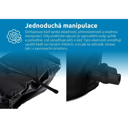 Díky odolnosti vůči teplotám v rozmezí -20 °C až 50 °C můžete káď využívat po celý rok, a to bez ohledu na počasí. Praktická výpusť umožňuje rychlé vypuštění vody, zatímco vnější kryt chrání káď před nečistotami, prachem a hmyzem. Termokryt navíc udržuje optimální teplotu vody, minimalizuje tepelné ztráty a zvyšuje energetickou úspornost. Tyto vlastnosti společně s jednoduchou manipulací dělají z ochlazovací kádě ideálního společníka na zahradu, terasu i do saunovacího prostoru.