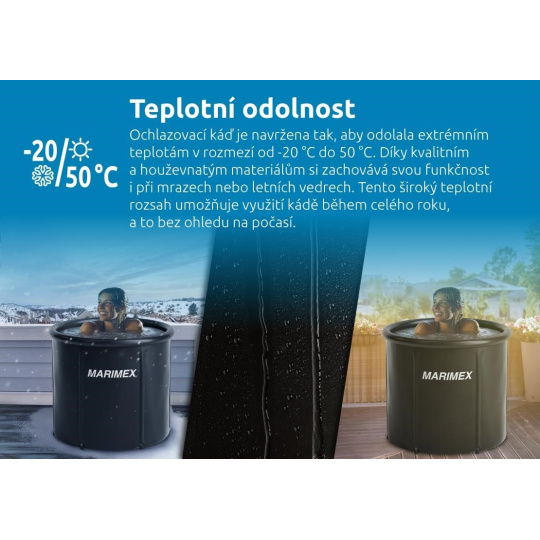 Káď je navržena tak, aby odolala teplotám od -20 °C do 50 °C. Díky tomu je ideální pro využití v jakémkoli počasí a ročním období.