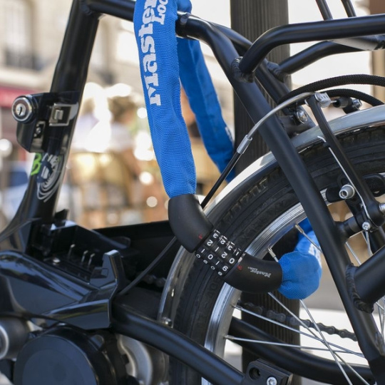 Zpevněný ocelový řetěz s integrovaným kombinovaným zámkem je 90 cm dlouhý a obsahuje ocelové spojky o průměru 8 mm, které odolávají řezání. Nylonový kryt řetězu zabraňuje poškrábání. Zámek obsahuje resetovatelnou kombinaci 4 číslic.