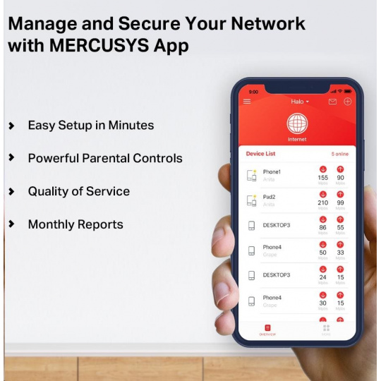 - Snadné ovládání pomocí aplikace – s aplikací MERCUSYS můžete rychle nastavit a spravovat Wi-Fi.