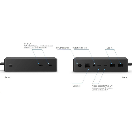 Originální a inovativní dokovací stanice Microsoft Surface Dock 2 je speciálně určena pro operační systém Windows 10 a zařízení Microsoft Surface. Disponuje rozhraním 2 x USB 3.2 Gen 2 (zadní, 7.5 W), 2 přední USB 3.2 Gen 2 (15W), 2 zadní USB 3.2 Gen 2 (DP1.4a) (7.5W), 3.5 mm audio in/out, gigabitový ethernet a zámkem Kensington. Podporuje až 2x 4K rozlišení, bleskurychlé dobíjení smartphonu přes USB-C a umožňuje administrátorské zásahy.