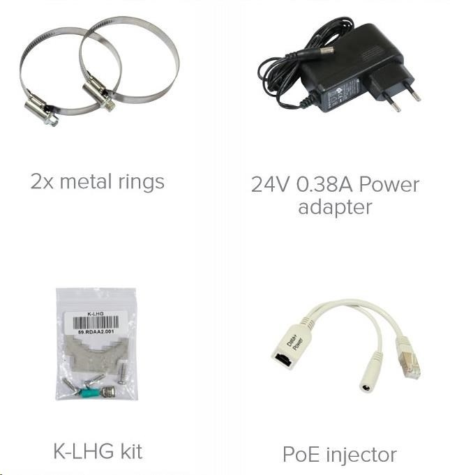 Balení obsahuje: 3x RBLHG-5nD, PoE injektor, napájecí zdroj, montážní sada na stožár