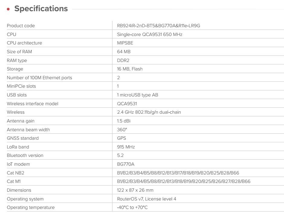 Brána IoT průmyslové třídy pro inteligentní sledování majetku, vzdálené monitorování a efektivní automatizaci - nyní s vylepšeným příjmem LoRa®, souběžným GPS + LTE CAT-M a nižší cenou. KNOT LR9G je kompaktní, ihned použitelná brána pro sítě založené na LoRa®, navržená tak, aby poskytovala cenově dostupnou a spolehlivou konektivitu i v těch nejodlehlejších prostředích. Podporuje LTE CAT-M1 a NB2, Bluetooth 5.2, 2,4 GHz Wi-Fi, GPS a Ethernet s PoE, což z něj činí flexibilní základ pro jakékoli nasazení IoT. Ať už sledujete cenná aktiva v nemocnici, spravujete prodejní automat v nákupním centru nebo monitorujete senzory na zemědělském poli. Funkce a vlastnosti: • Souběžné GPS a LTE CAT-M Sledujte pohybující se aktiva pomocí přesného GPS a zároveň udržujte živé připojení LTE CAT-M1. Ideální pro mobilní jednotky, jako jsou servisní vozidla, kontejnery nebo roamingové terénní zařízení. • Univerzální napájení Vyberte si z PoE-in, DC jack nebo MicroUSB – včetně PoE-out na Ether2 pro napájení dalších zařízení. • SMA konektory pro všechny hlavní rozhraní Snadné nastavení antény pro LTE, GPS a LoRa®. • Vylepšený příjem 915 MHz LoRa® Vylepšená citlivost pro silnější signál a delší dosah, i v prostředí s velkým rušením. • Nižší cena, stejná spolehlivost Cenově výhodné pro rozsáhlá nasazení bez snížení výkonu. • Poháněno RouterOS v7 Pro plnou kontrolu, vlastní skriptování a pokročilé funkce směrování. Příklady praktického nasazení: Sledování majetku nemocnice Připojte majáky Bluetooth ke kritickému zdravotnickému vybavení. Nainstalujte KNOT LR8G do každého skladovacího prostoru. Při pohybu zařízení KNOT detekuje blízké štítky, sleduje polohu pomocí GPS a odesílá aktualizace přes LTE CAT-M - udržuje aktuální stav inventáře a snižuje počet manuálních kontrol. Zemědělství a odlehlé lokality Nasaďte KNOT ke sběru dat z půdních nebo meteorologických senzorů na venkovských polích. Díky podpoře širokého pásma, příjmu LoRa® a kompatibilitě s GPS je ideální pro sběr dat na velké vzdálenosti a s nízkou spotřebou energie. Monitorování chladicího řetězce Používejte kabelové senzory Modbus ke sledování teploty a vlhkosti uvnitř chladicích kontejnerů. KNOT převádí Modbus na TCP a bezpečně předává data prostřednictvím MQTT nebo HTTPS s využitím nízkopásmového LTE nebo NB-IoT. Průmyslová automatizace Přemostění starších kabelových senzorů a akčních členů do cloudu. Díky podpoře lišty DIN a monitorování GPIO se KNOT snadno integruje do průmyslových rozváděčů nebo výrobních prostředí. Upozornění: IoT brána není plnohodnotným LTE routerem. SIM karta není určená pro vytáčení připojení, ale pro komunikaci v síti IoT. IoT brána nedisponuje LTE modemem. Jak by to všechno fungovalo v reálném životě? Představme si nemocnici. Spousta drahého majetku se pohybuje v obrovských budovách. Nástroje, vybavení, léky, na co si vzpomenete. Všechno se neustále přesouvá. neustále přesouvá. Nemocnice obvykle musí vynakládat spoustu prostředků na kontrolu inventáře. Pojďme to napravit. Umístěte na všechny důležité položky lokalizační Bluetooth čipy. Přidejte zařízení KNOT do každého skladovací místnosti. Nyní vedení nemocnice vždy ví, zda se vybavení vrátilo na své místo. Technické specifikace: Product code: RB924iR-2nD-BT5&BG770A&R11e-LR9G CPU: Single-core QCA9531 650 MHz CPU architecture: MIPSBE Size of RAM: 64 MB RAM type: DDR2 Storage: 16 MB, Flash Number of 100M Ethernet ports: 2 MiniPCIe slots: 1 USB slots: 1 microUSB type AB Wireless interface model: QCA9531 Wireless: 2.4 GHz 802.11b/g/n dual-chain Antenna gain: 1.5 dBi Antenna beam width: 360° GNSS standard: GPS LoRa band: 915 MHz Bluetooth version: 5.2 IoT modem: BG770A Cat NB2: B1/B2/B3/B4/B5/B8/B12/B13/B17/B18/B19/B20/B25/B28/B66 Cat M1: B1/B2/B3/B4/B5/B8/B12/B13/B18/B19/B20/B25/B26/B27/B28/B66 Dimensions: 122 x 87 x 26 mm Operating system: RouterOS v7, License level 4 Operating temperature: -40°C to +70°C Napájení: Number of DC inputs: 3 (DC jack, Micro USB, PoE-In) DC jack input Voltage: 12-57 V Micro USB input Voltage: 5-5 V PoE-In input Voltage: 18-57 V Power adapter nominal voltage: 24 V Power adapter nominal current: 1.2 A PoE-In: 802.3af/at PoE-Out: Passive PoE Smart PoE: Injector PoE-Out ports: Ether2 Max out per port output (input < 30 V): 650 mA Max out per port output (input > 30 V): 450mA Max power consumption (without attachments): 6 W Max power consumption: 23 W Internet věcí (anglicky Internet of Things, zkratka IoT) je termínem pro moderní přístroje ovladatelné i na dálku pomocí internetu. Snadno je tak obsloužíte pomocí svého chytrého telefonu nebo je jednoduše připojíte k centrální jednotce. Umožní tak snadno zautomatizovat věci, o které byste se jinak museli postarat sami. Jedná se o technologický koncept umožňující realizaci takzvaného "inteligentního domu" (automatické zhasínání světel, ovládání vytápění apod.). Umožňuje řídit klimatizaci, vyhřívání vašeho bazénu, ohřev vody, pečovat o vaše akvárium, obsluhovat nastavení alarmu či mechanických zámků. Pokud si nejste jistí, zda jste v ranním shonu vypnuli žehličku, můžete na dálku odpojit od sítě jednotlivé zásuvky. Vaše lednička vás dokáže upozornit na chybějící potraviny a připravovat aktualizovaný nákupní seznam. Upozornění Výrobce Mikrotik neposkytuje záruku na zařízení poškozená přepětím. Zařízení je třeba adekvátně chránit proti indukovanému elektrostatickému přepětí či přepěťovým špičkám na silovém vedení. Pro venkovní instalace používat výhradně stíněnou kabeláž (FTP/SFTP), jednotky korektně uzemnit (užití integrovaného zemníc
