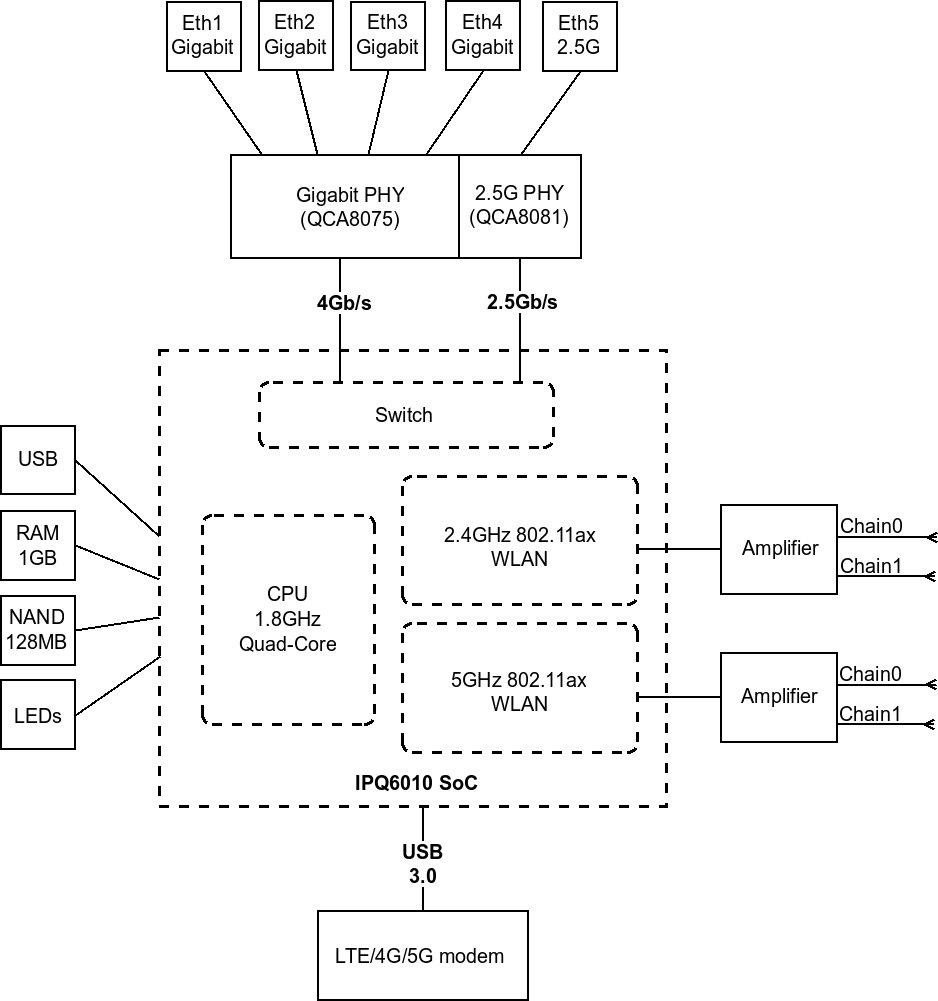 Popis produktu Chateau LTE18 ax je Dual Band 2.4/5GHz Wi-Fi 6 router do domácnosti či malých firem s (4) Gigabit LAN + (1) 2.5-Gigabit porty, LTE18 modemem, jedním USB portem, L4 licencí a extra rychlým 4-jádrovým ARM CPU s taktem 1800 MHz, vnitřním uložištěm 128 MB a 1 GB RAM. Uživatel tak může souběžně používat 2.4GH... více