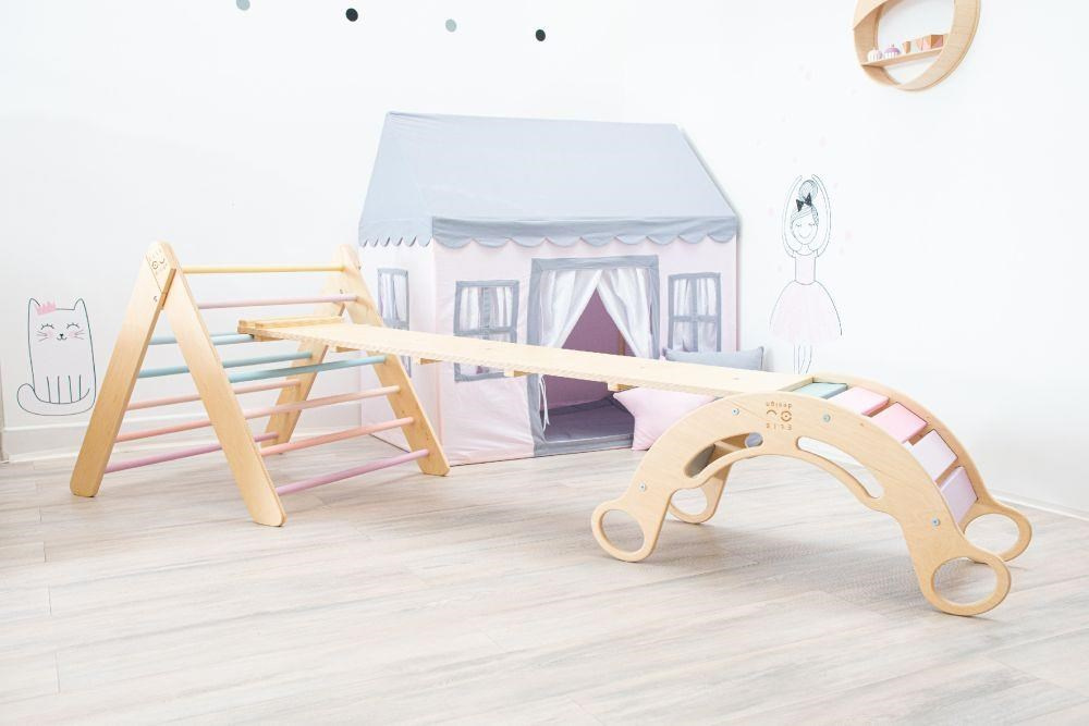 Montessori duhová houpačka 5in1 natur, lakované okraje, duhové desky