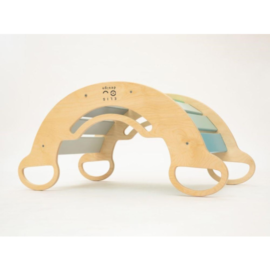 Dětská dřevěná Montessori houpačka smile 6in1, v příjemných pastelových barvách v modro-zelných tónech v kombinaci s neutrální šedou, vás překvapí svým designem i multifunkčností. Houpačka bude každý den svým širokým úsměvem lákat děti k příjemnému pohoupání i k zábavné hře. Její využití je všestranné, může být houpačkou, skluzavkou, prolézačkou, skrýší i sedačkou, při doplnění oboustranným prknem i dětským nábytkem. Oboustranné prkno není součástí houpačky. Vyrobená je z těch nejkvalitnějších materiálů, ručně dohladka opracovaná a lakovaná barvami s atestem. Montessori houpačka smile je širší než naše Montessori houpačky 5in1, proto k této houpačce nabízíme i speciální oboustranné prkno, které je doplňkem k houpačkám smile. Díky prknu snadno proměníte houpačku smile v dětský stoleček. Oboustranné prkno není součástí houpačky, pro využití houpačky jako nábytku je nutné prkno samostatně dokoupit..