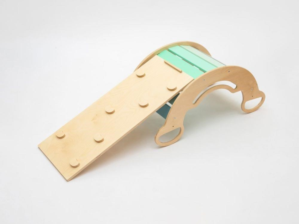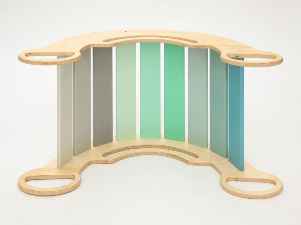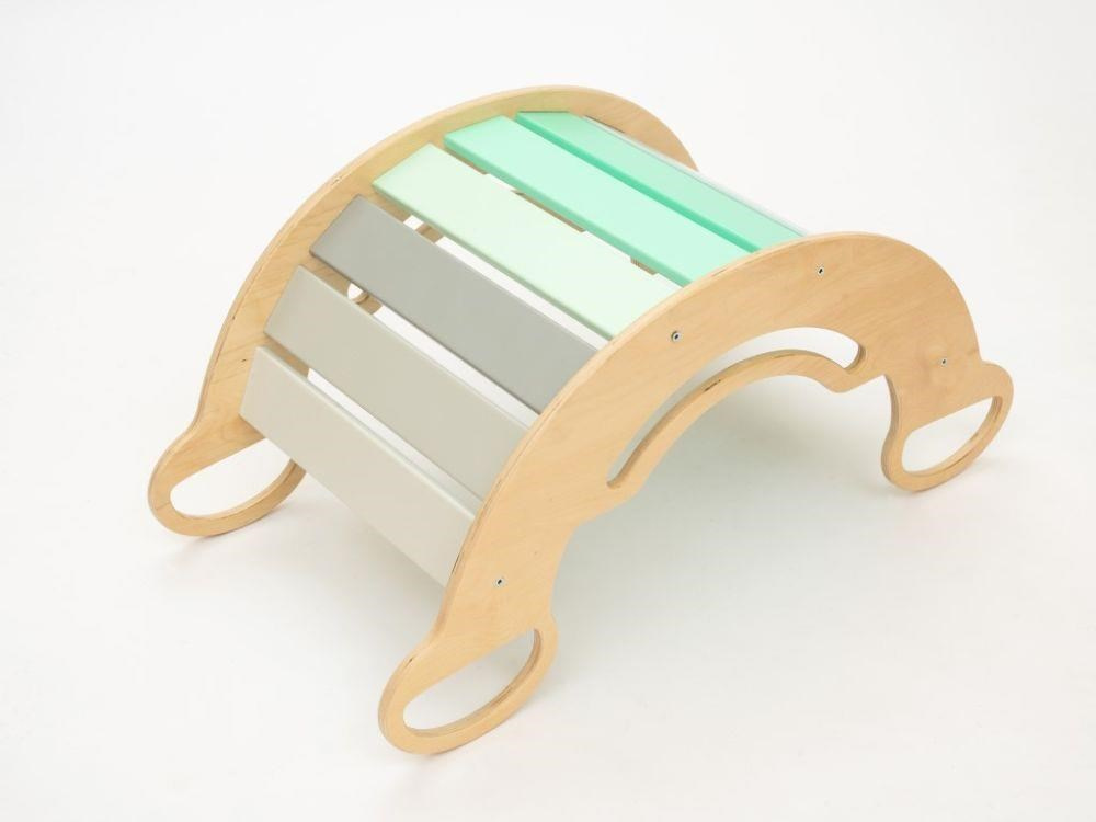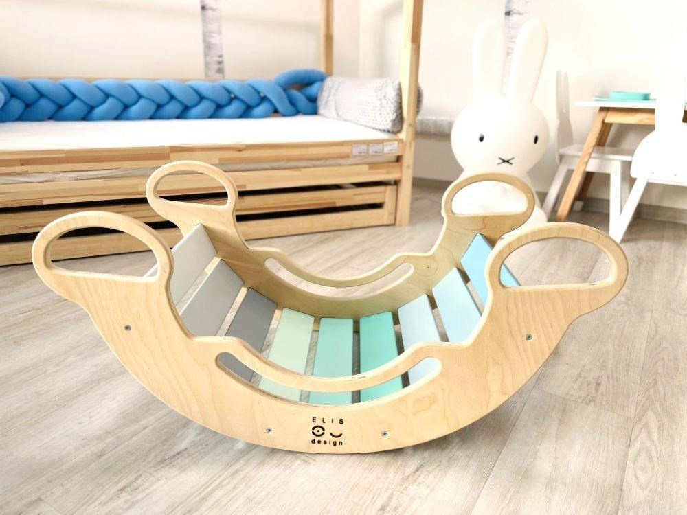 Dětská dřevěná Montessori houpačka smile 6in1, v příjemných pastelových barvách v modro-zelných tónech v kombinaci s neutrální šedou, vás překvapí svým designem i multifunkčností. Houpačka bude každý den svým širokým úsměvem lákat děti k příjemnému pohoupání i k zábavné hře. Její využití je všestranné, může být houpačkou, skluzavkou, prolézačkou, skrýší i sedačkou, při doplnění oboustranným prknem i dětským nábytkem. Oboustranné prkno není součástí houpačky. Vyrobená je z těch nejkvalitnějších materiálů, ručně dohladka opracovaná a lakovaná barvami s atestem. Montessori houpačka smile je širší než naše Montessori houpačky 5in1, proto k této houpačce nabízíme i speciální oboustranné prkno, které je doplňkem k houpačkám smile. Díky prknu snadno proměníte houpačku smile v dětský stoleček. Oboustranné prkno není součástí houpačky, pro využití houpačky jako nábytku je nutné prkno samostatně dokoupit..