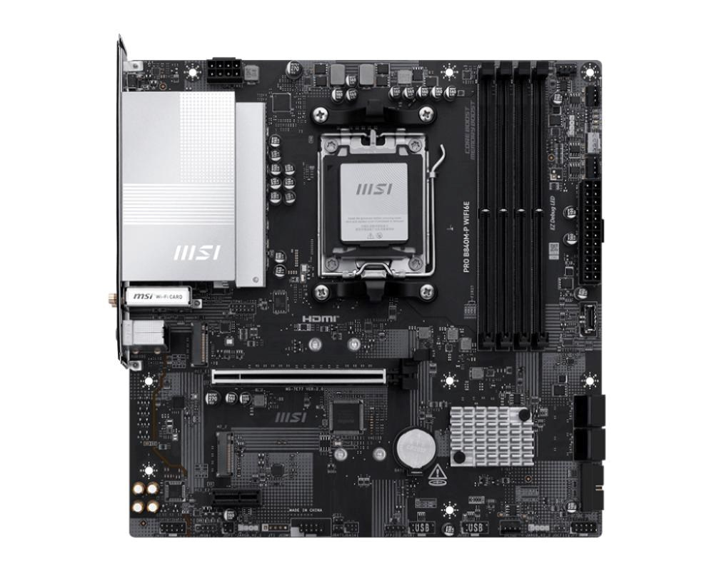 PRO B840M-P WIFI6E offers a simple design with a harmonious silver color scheme that perfectly matches both white and black PC builds. It is engineered with many exclusive features of MSI, a Wi-Fi 6E with EZ Antenna, 2.5G LAN, and PCIe 4.0 M.2, ready for the AMD Ryzen™ 9000 series processors.