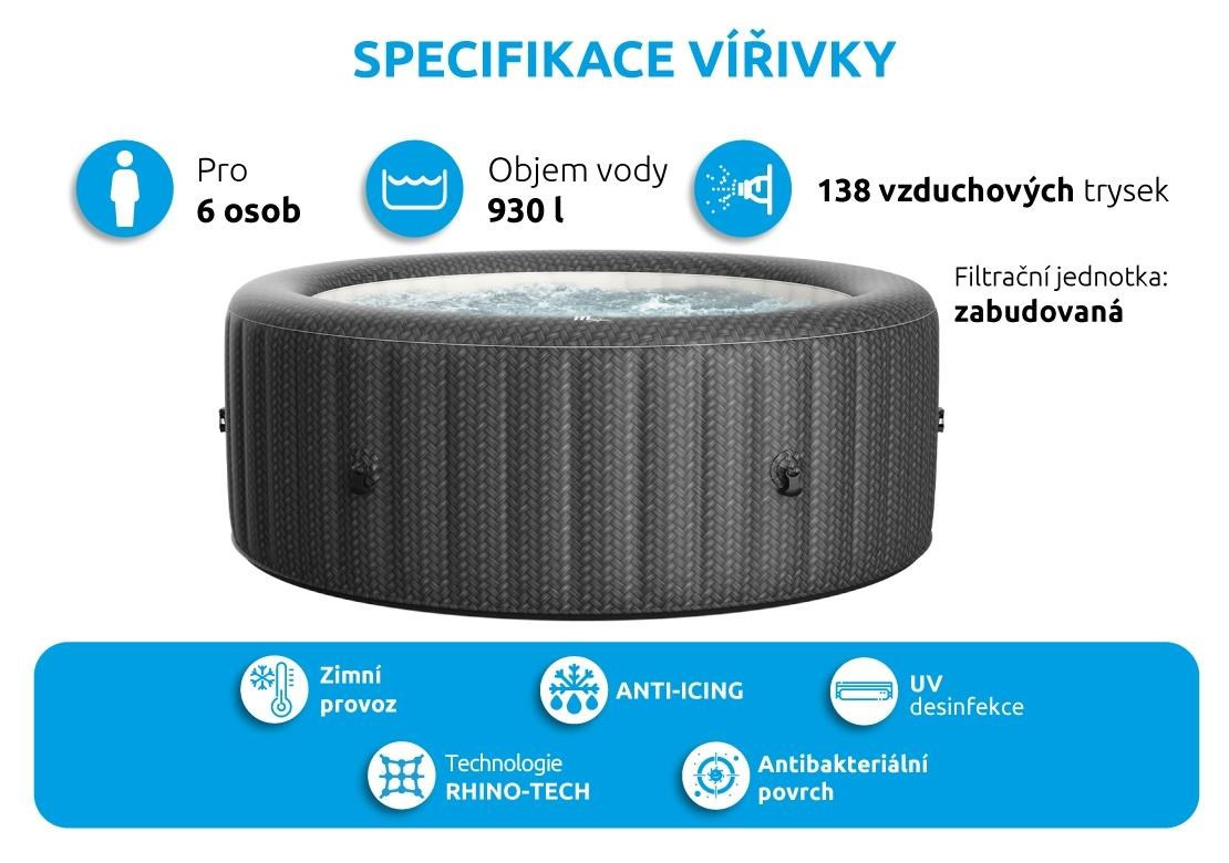 Výhodou je 138 vzduchových trysek a účinný ohřev vody. Uvnitř ovládací jednotky je zabudovaná mini sterilizační komora s UV LED lampou, která zajišťuje, že každá kapka vody v Mspa je pod neustálou ochranou.