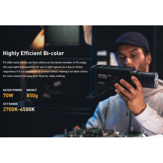 Model FS-60B je studiové světlo pro začátečníky, kteří chtějí něčeho dosáhnout jak ve fotografování, tak v natáčení videí – je to kompaktní dvoubarevné LED světlo, které za dané peníze nabízí vysokou hodnotu.