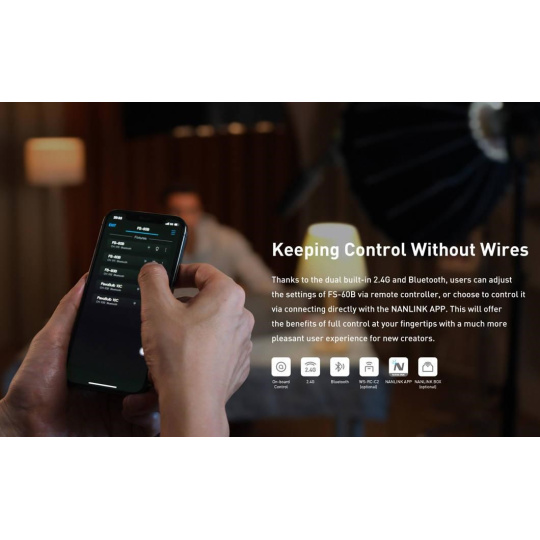 Model FS-60B je vybaven 1,3" OLED displejem pro přímé, přesné a snadné ovládání. Lze jej ale také ovládat vzdáleně prostřednictvím Bluetooth a aplikace NANLINK, která je zdarma a je určena pro systémy iOS i Android, pomocí 2.4GHz připojení s využitím samostatně dostupného manuálního dálkového ovladače WS-RC-C2 nebo boxu vysílače WS-TB-1.