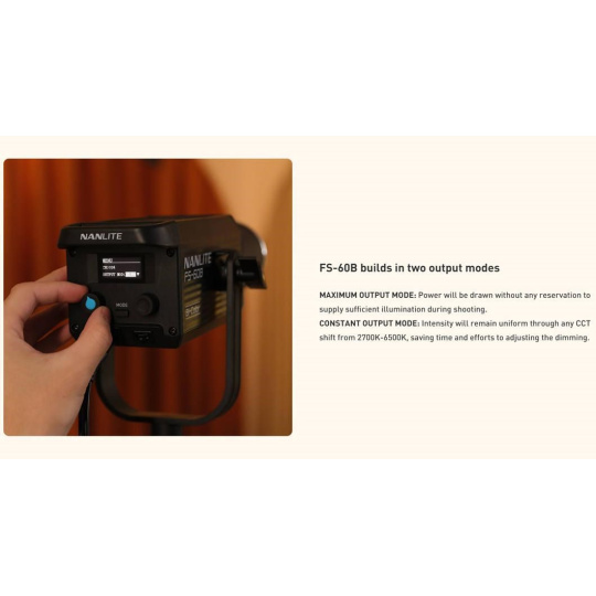 Světlo FS-60B se používá jednoduše pomocí dvou vestavěných knoflíků pro stmívání od 0 do 100 % a regulaci teploty barev. Můžete nastavit chladnější tóny bílé až teplejší tóny a cokoli mezi tím, a najít tak správnou míru osvětlení pro vaši konkrétní scénu. Světlo má také jedno tlačítko a 1,3" OLED displej pro intuitivní nastavování. Kromě snadného ovládání obsahuje model FS-60B vestavěný ventilátor, který neruší zvukové nahrávky, a v případě, že je třeba absolutní ticho, jej lze vypnout.