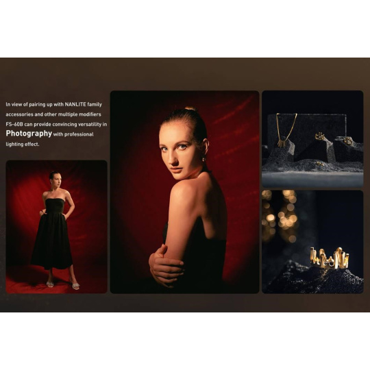 Model FS-60B má 12 vestavěných přizpůsobitelných efektů a dodává se spolu s adaptérovým bajonetem Bowens pro samostatně dostupné modifikátory světla.