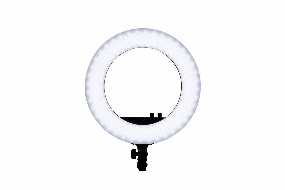 Stmívatelné dvoubarevné LED kruhové světlo Nanlite Halo 18 s napájením pomocí AC adaptéru. Součástí balení je také držák na telefon a oboustranné make-up zrcátko.