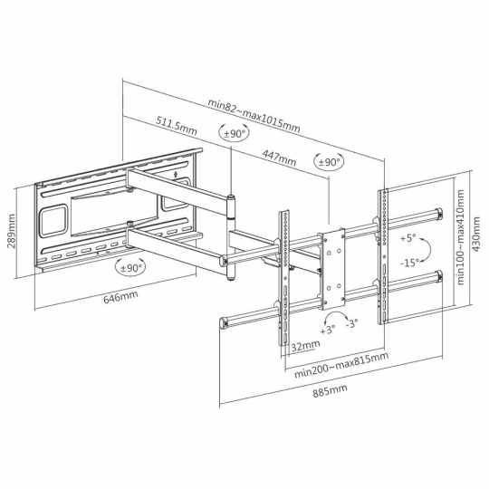 Nejdelší držák televize Fiber Mounts Big1 Nastavitelná vzdálenost od zdi 82mm až 1015mm, otočení kolmo ke zdi Tv s úhlopříčkou 43-80", naklápění +5° až -15°, korekce roviny +/- 3°, podporuje VESA standardy 200x100 až 800x400, nosnost 50kg Nejdelší držák pro otáčení velkých televizí i kolmo ke zdi. Díky nastavitelné vzdálenosti od zdi 82mm až 1015mm umožňuje držák Fiber Mounts Big1 otočení o 90° na obě strany i televizorů s úhlopříčkou 43" až 80". Vysoká nosnost 50kg zajišťuje bezpečné zavěšení a polohování i opravdu velkých televizorů. Konstrukce držáku Big1 je ocelová, nástěnný úchyt o rozměrech 646x289mm zajistí vynikající rozložení celkové hmotnosti na zdi. V balení naleznete instalační materiál. Záruka 3 roky. Nejdelší otočný držák na Tv Fiber Mounts Big1 Technické údaje: nosnost 50kg na televize s roztečí VESA 200x100 až 800x400 zavěšení a otáčení kolmo ke zdi Tv 43" až 80" nastavitelná vzdálenost od zdi 82mm až 1015mm možnost naklápění televize +5° až -15° korekce roviny obrazovky +/- 3° instalační materiál součástí balení (viz. níže) velmi pevná a bezpečná konstrukce zajištění Tv na držáku proti vysazení materiál ocel hmotnost držáku 13,5kg velká instalační plocha pro rozložení hmotnosti na zdi 646 x 289mm barevné provedení černé záruka 3 roky Fiber Mounts Big1 Vám otočí kolmo ke zdi i velmi velké televize Držák Fiber Mounts Big1 podporuje VESA standardy: VESA 200x100 VESA 200x200 VESA 300x200 a 200x300 VESA 300x300 VESA 400x200 a 200x400 VESA 400x300 a 300x400 VESA 400x400 VESA 600x400 VESA 800x400 Nejdelší držák na televize Big1 má i bezpečný systém pro zajištění televize na držáku Instalační materiál, který najdete v balení s držákem Fiber Mounts Big1: hmoždinky o12x60 6ks vruty do hmoždinek 8x90 mm 6ks podložky na vruty 6ks šrouby M5x14 4ks šrouby M6x14 4ks šrouby M6x30 4ks šrouby M8x30 4ks šrouby M8x50 4ks univerzální podložky na šrouby 4ks distanční podložka 5mm 8ks distanční podložka 10mm 8ks V případě, že dodávané šrouby nebudou pro uchycení televizoru vhodné (ani v případě použití podložek nebo distančních válečků), je nutné změřit potřebnou délku a průměr šroubů a zakoupit je obchodě (např. železářství, v nářadí apod.). Fiber Mounts Big1 je nejdelší otočný držák na velké televize Televizní držák Fiber Mounts Big1 je ideální pro možnost otáčení středně velkých a velkých televizorů (43" až 80") na obě strany (např. z obývacího pokoje do kuchyně apod.). Otočení je možné až o 90° na obě strany, tedy kolmo ke zdi. Vynikající bezpečnost a stabilita je zajištěna silnostěnnou ocelovou konstrukcí (hmotnost držáku 13,5kg), o výborné rozložení celkové hmotnosti na zdi se postará velká instalační plocha o rozměrech 646 x 289mm..