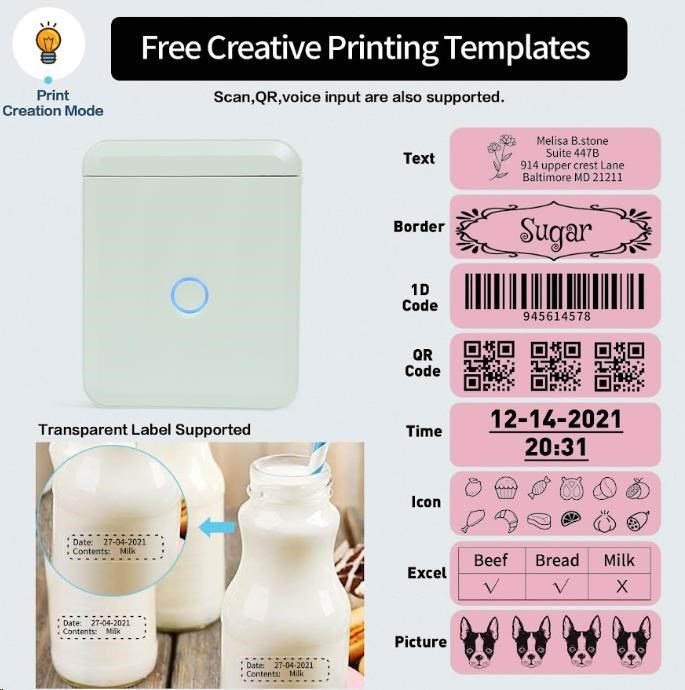 Při navrhování štítku můžete použít různá písma, tvary, ikony, velikosti a formáty, abyste si vytiskli etikety nebo štítky podle své představy. Můžete importovat fotografie z vašeho telefonu nebo obrázky z internetu, aby byl design jedinečnější. Bezplatná aplikace pro iOS nebo Android nabízí více než 1500 ikonek, více než 100 rámečků, 19 fontů písma a umožňuje také tisk QR kódů. Můžete si vybrat z různých stylů písma, velikostí a formátů, abyste si vytiskli etikety nebo štítky přesně podle své představy. Tiskárna automaticky rozezná vložené etikety a aplikace přizpůsobí rozměry pro tisk.