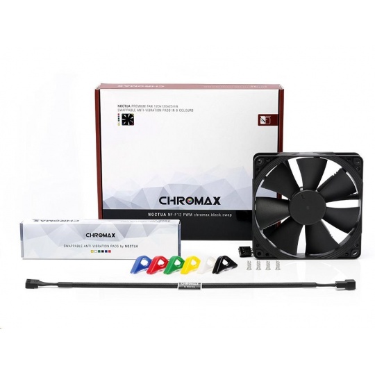 ventilátor, tichý, rozměry 120x120x25mm, hlučnost 18.6 až 22.4dB, průtok 74.3 až 93.4 m3/h, 300 až 1500 otáček, optimalizovaná geometrie a povrch 7 lopatek, SSO2, edice Chromax - vyměnitelné barevné antivibrační podložky