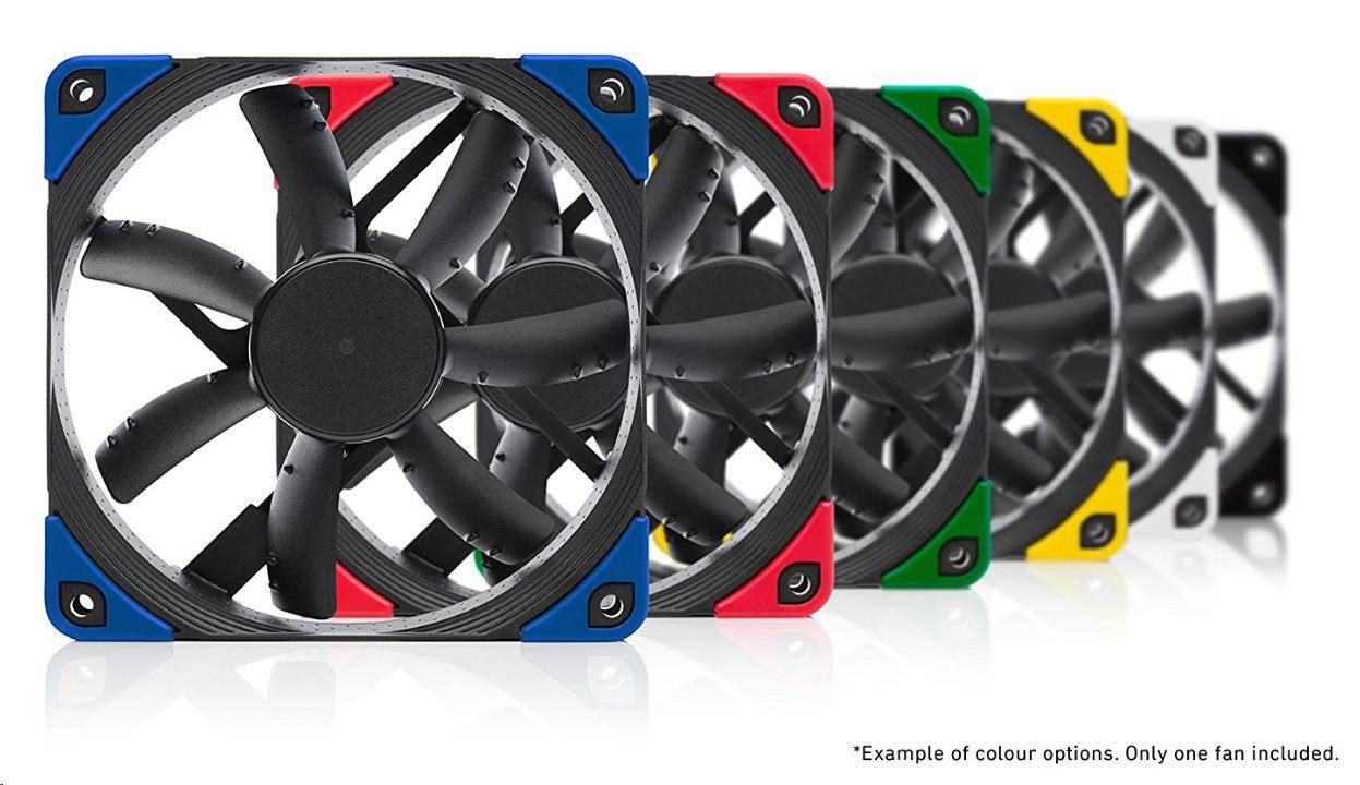 ventilátor, ultratichý, rozměry 120x120x25mm, hlučnost 17.8dB, průtok 107.5 m3/h, 300 až 1200 otáček, optimalizovaná geometrie a povrch lopatek, SSO2, edice Chromax - vyměnitelné barevné antivibrační podložky