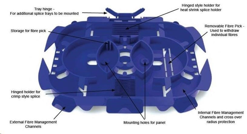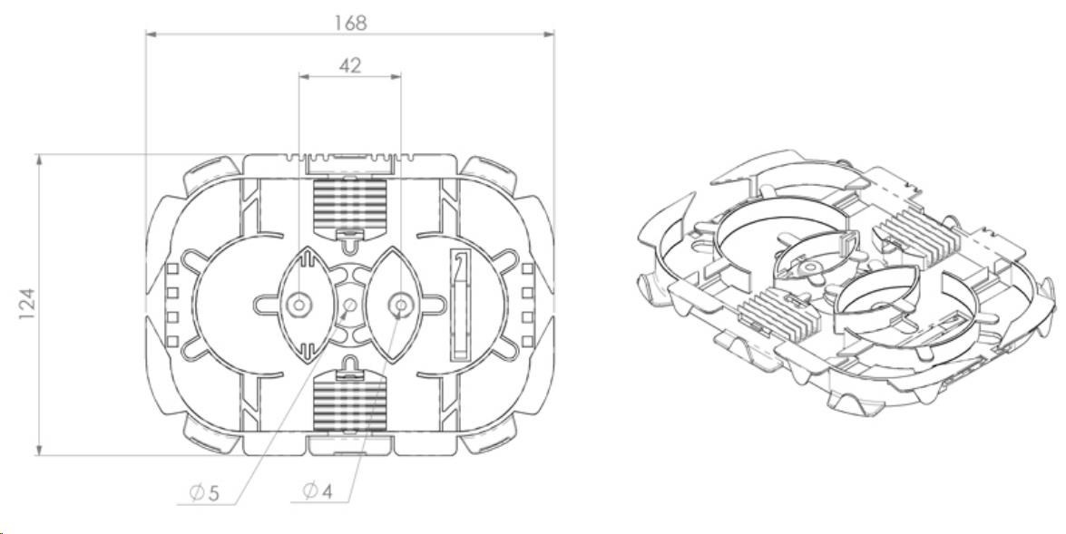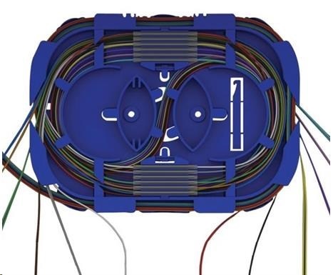 - dva hřebínky, pro celkovou kapacitu 24 ochran svárů. (Uchycení a konstrukční řešení výklopných hřebínků umožňuje vedení vláken i pod nimi)