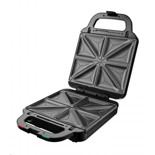 Multifunkční toustovač 3 v 1, 3 výměnné desky s kvalitním nepřilnavým povrchem, Sendvičovač pro 4 sendviče, vafle a grilování, Funkce otevřeného grilu, Tepelně izolované držadlo, Jednoduché čištění, plotny omyvatelné i v myčce nádobí, Světelná signalizace (napájení, ohřev) Tepelná pojistka, Napájení: 220 - 240V~ 50Hz, 1 400 W.