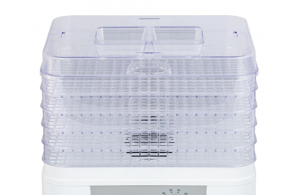 Sušička potravin s pěti nastavitelnými mřížkami, vysoceúčinný ohřívač a ventilátor zajišťují důkladnou cirkulaci vzduchu pro rychlé a efektivní vysušování, jednoduché ovládání pomocí otočného ovladače teploty, rozsah nastavitelné teploty od 35 ° C do 70 ° C, bezpečnostní pojistka, napájení 230V ~ 50Hz, 230W, šířka: 320 mm, výška: 270 mm, hloubka: 255 mm.