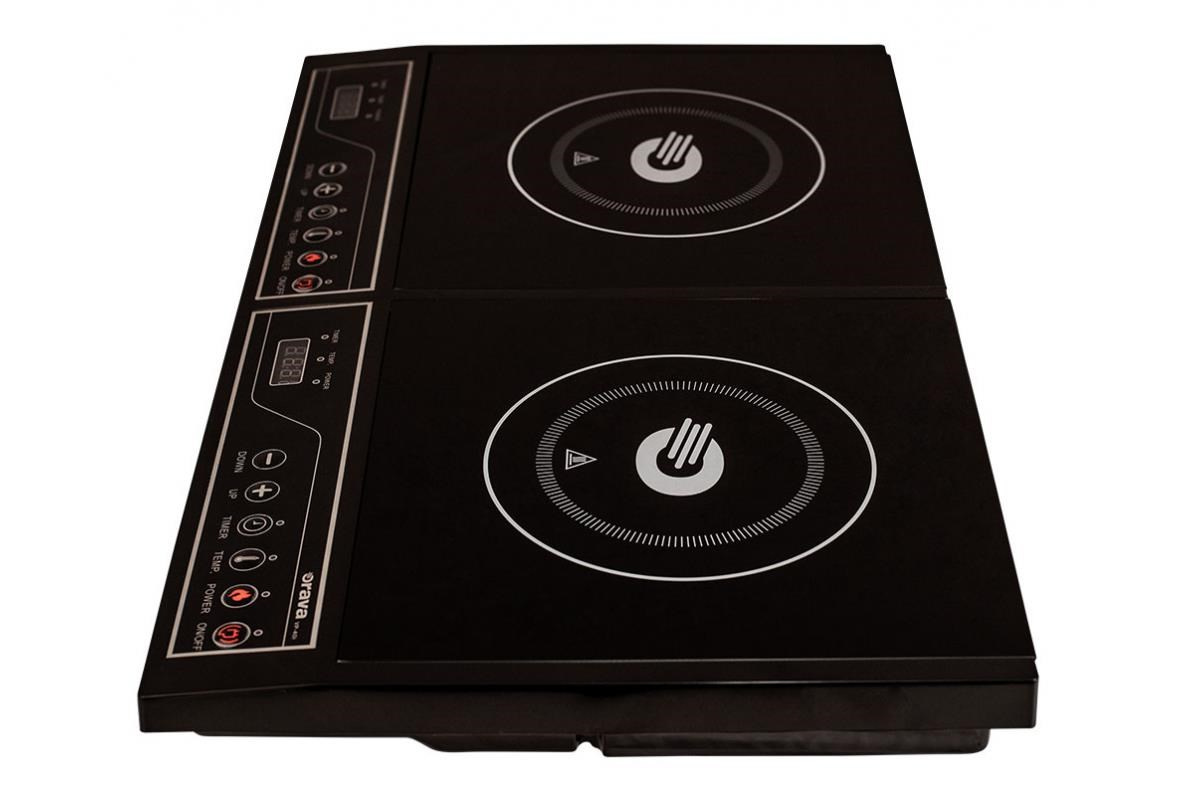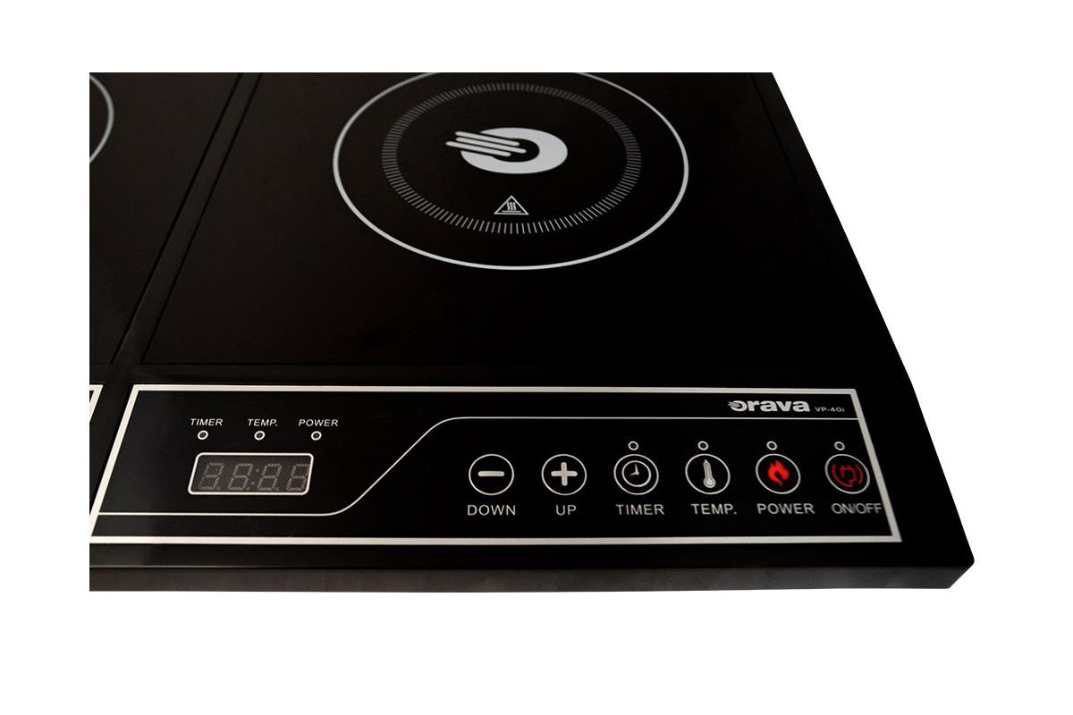 Indukční vařič Orava. Indukční vařič VP-40i se dvěma varnými zónami, které tvoří elegantní černé sklo s velmi jednoduchou údržbou. Přehledné dotykové ovládání umožňuje osm úrovní nastavení teploty od 60°C do 240°C. Časovač, LED displej.
