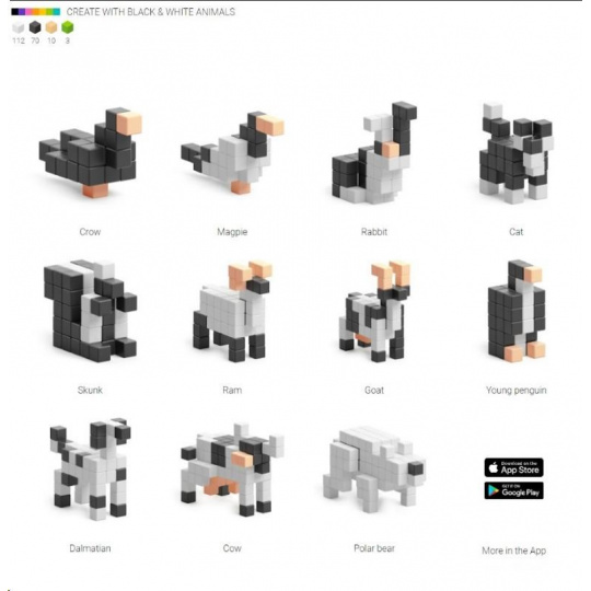DESIGNOVÁ ŘADA PIXIO Black and White Animals obsahuje 195 bloků PIXIO ve 4 barvách. Umožní