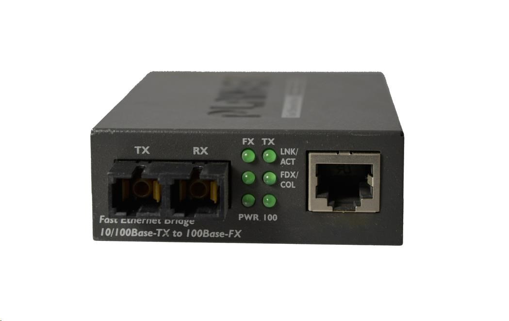 Fast Ethernet přepínač 10/100Base-TX - 100Base -FX (SC), single mode, spojení do 15 km. Full duplex, 1k MAC adres, malé rozměry. (26x70x110mm), bridge.