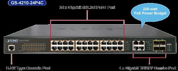 Planet GS-4210-24PL4C PoE+ switch 28x 1000Base-T, 4x SFP, 802.3at do 440W, VLAN, SNMPv3/WEB
