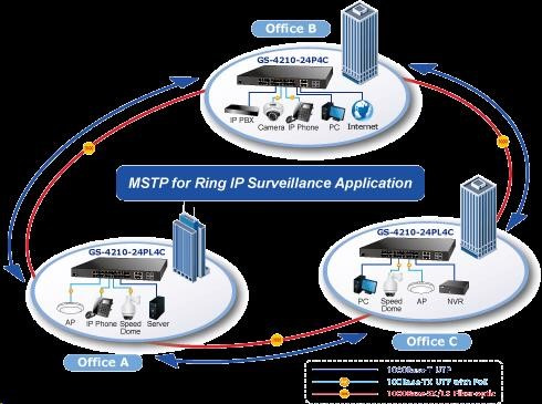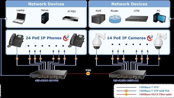 Gigabitový spravovatelný přepínač s PoE (power over ethernet) porty pro centralizované napájení zařízení po ethernetu jako jsou IP kamery, WiFi prvky nebo VOIP telefony. Zařízení je svým provedením vhodné jak pro instalaci do kancelářských nebo prezentačních prostorů. Je vhodné i pro aplikace v lokálních rozvaděčích, připojení lze realizovat optickýmy porty SFP. Bezpečnou správu zajistí šifrovaná webová správa nebo SNMPv3 protokol. Připojení koncových uživatelů lze zabezpečit ACL/MAC pravidly nebo možnou autorizací na server RADIUS/TACACS. Vlastnosti: - 28 portů 1000Base-T, Switching, Full Duplex (1000/2000 Mbps), Auto-Negotiation (10/100/1000 Mbps) - 24x vestavěné PoE injektory 802.3at, každý injektor až 30W/port; celkový max. napájený výkon až 440W - 4x SFP sdílené s metalickými (25-28), 100/1000Base-X, pro instalaci optických modulů mini-GBIC s označením MFB a MGB - Auto-MDI/MDI-X, automatická detekce přímý skřížený kabel i pro 10/100Mbps - ESD ochrana na všech portech do 2kV DC - 8k MAC adres, 4,1MB buffer - propustnost: 52Gbps sběrnice, datově 42Mp/s (64B) - podpora přenosu Jumbo rámců o velikosti 10KB - správa: WEB / SNMPv3 / telnet / konzole; podpora SSL/SSH - podpora protokolů IPv4/IPv6 - VLAN IEEE 802.1Q, až 256 skupin, až 4094 VLAN ID; protokolové, VoIP a privátní VLAN - agregace portů LACP 802.3ad, až 8 skupin po 8 portech - QoS 8 front, klasifikace podle provozu, váženého průměru nebo značky VLAN - Spanning tree protokol: STP IEEE 802.1D / RSTP IEEE 802.1w / MSTP IEEE 802.1s - IGMPv3 Snooping, Querier, až 256 multicast skupin - zrcadlení portů-port mirroring TX/RX/TX+RX/více na jeden port - zabezpečení klientů: ACL (access control list), MAC statická tabulka pro autorizovaná zařízení, autorizace na RADIUS/TACACS+, DHCP snooping, spojení IP+MAC na porty - ochrana proti DoS útokům - pole LED indikátorů pro diagnostiku provozu - tepelná ochrana proti přehřátí - rozměry: (440 x 300 x 44,5)mm, montáž 19"/1U - hmotnost 4,8kg - provozní teplota: 0-50°C - interní napájecí zdroj AC 110-240V/50-60Hz, vlastní příkon asi 30W.