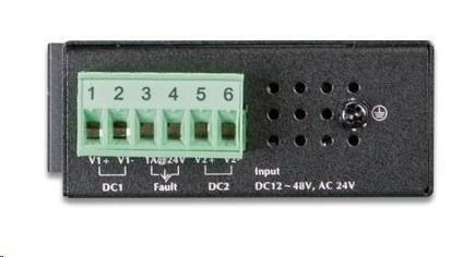 5portový 100Mbitový přepínač a konvertor pro průmyslové aplikace. Možnost redundantního napájení DC 12-48V / AC 24V, příkon <2W.