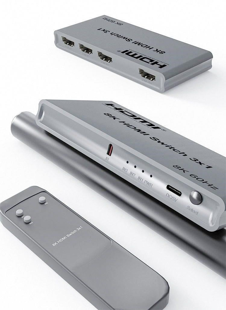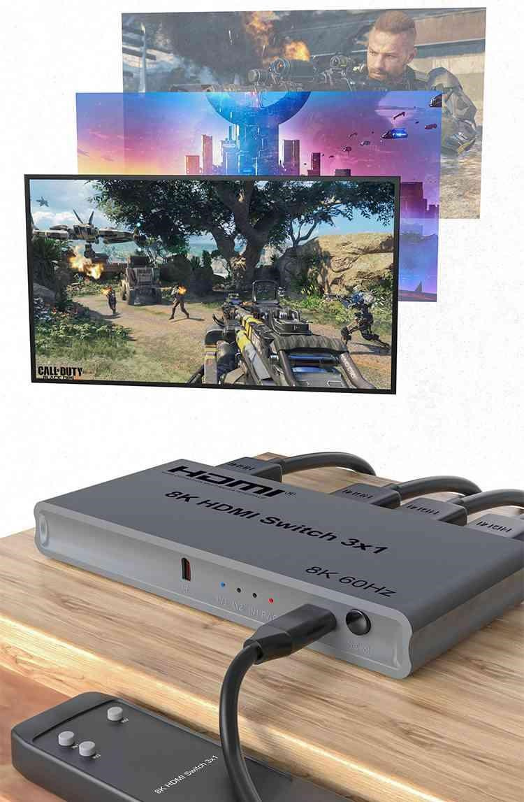 3 HDMI zařízení na vstupu sdílejí 1 výstupní monitor, projektor. Výběr vstupních zařízení: 1.automaticky, 2.stisknutím tlačítka na čele přepínače, 3.dálkovým ovladačem