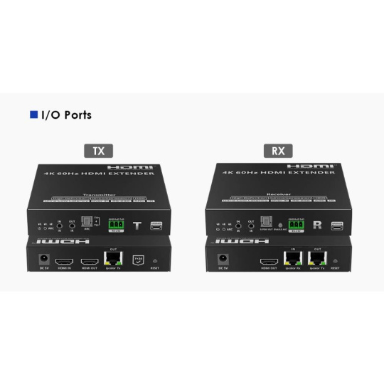 Zařízení umožňuje po jednom síťovém kabelu nebo prostřednictvím 10G LAN sítě přenést nekompreovaný 4K@60Hz HDMI signál s extrémně malým zpožděním a ve špičkové kvalitě až na 80m a současně IR signály, RS232 a digitální zvuk.