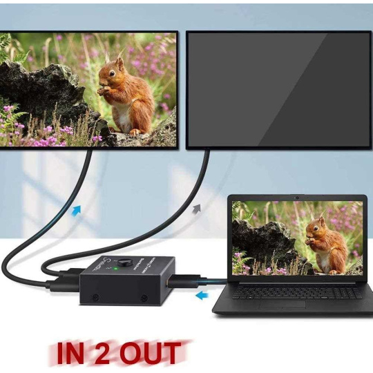 - Obousměrný 2x1 / 1x2 Přepínač HDMI lze použít dvěma různými způsoby: připojit 2 vstupní zdroje s 1 výstupním displejem nebo 1 vstupní zdroj se 2 displeji (funguje pouze na 1 obrazovce, nikoli současně).