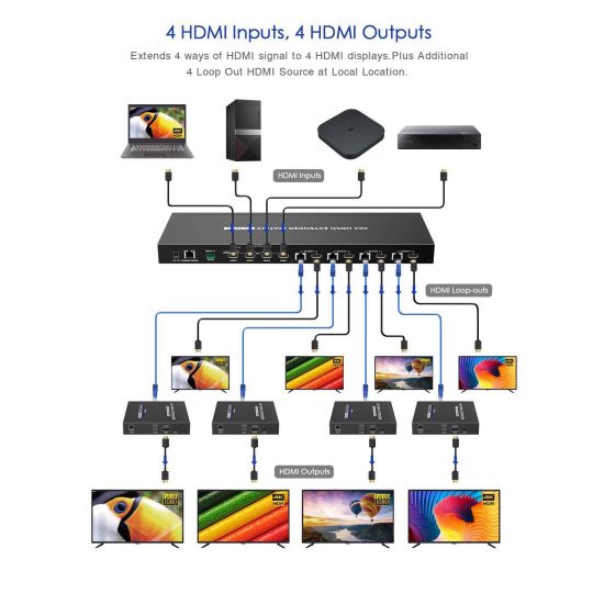 Umožní přepínat a propojit čtyři zdroje HDMI signálu na 4 HDMI zobrazovače, monitory na velkou vzdálenost až 70m pomocí UTP kabelu a navíc 4 lokální monitory