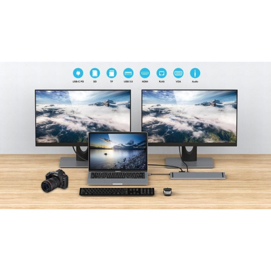 Umožní přidat další monitor a USB periferii nebo paměť a současně napájet přes konektor PD. Umožňuje také pracovat na více obrazovkách současně.