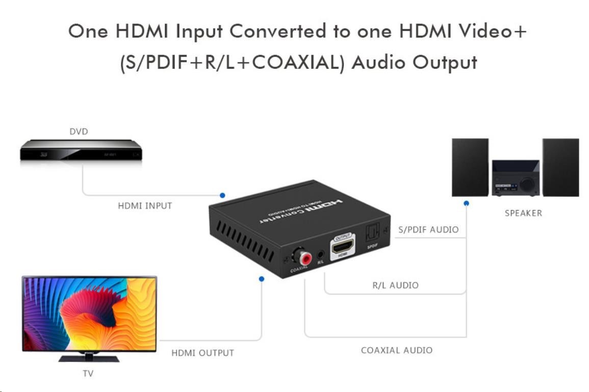 Umožní oddělit audio z HDMI2.0 vstupu na analogové / digitální audio, které je vyvedeno zvlášť na konektory: stereo jack, Digitální audio RCA CINCH nebo digitální optické TOSLINK (SPDIF)