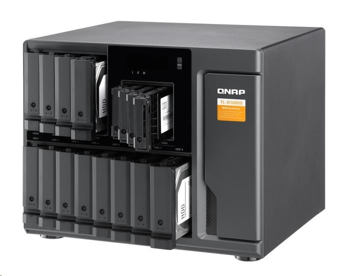 TL-D1600S je vybaven dvanácti 3,5“/2,5“ SATA 6Gb/s diskovými sloty a čtyřmi 2,5“ SATA 6Gb/s SSD sloty, navíc obsahuje i kartu QXP PCIe pro připojení expanzní jednotky pomocí kabelu SFF-8088 (nebo SFF-8644). Poskytuje spolehlivý výkon při čtení a zápisu pro snadné ukládání a zálohování dat.