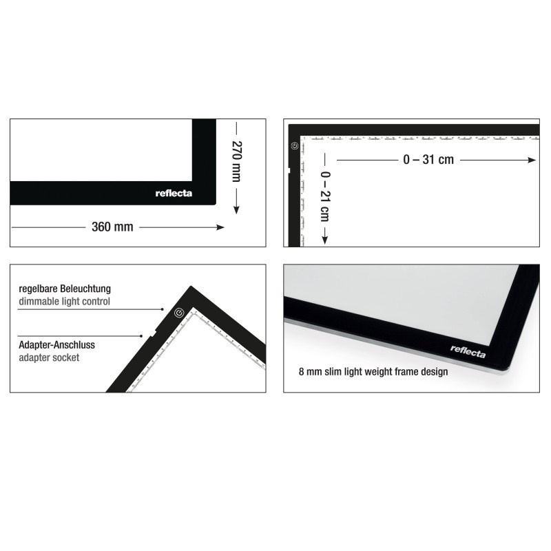 Prosvětlovací panel s UltraSlim LED technologií, prosvětlovací plocha 31x21cm s měřítkem v cm, plynulá regulace výkonu, 3000/ 5000/ 8000K, CRI vyšší než 90, dotykové ovládání, síťový zdroj 5V/2A/10W - micro USB, životnost LED 50.000h. Rozměry 37,1x27,8x0,8cm, hmotnost 640g..
