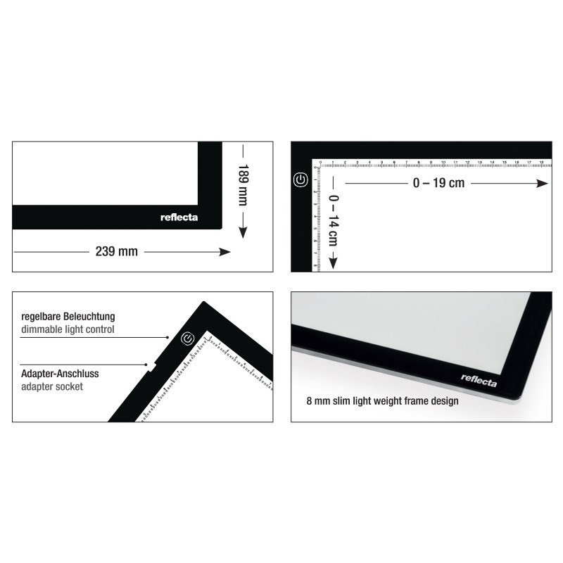 Prosvětlovací panel s moderní SuperSlim LED technologií, prosvětlovací plocha 19x14cm s měřítkem v cm na okraji plochy, plynulá regulace výkonu, dotykové ovládání, síťový zdroj AC/DC 12V/4,3W - 3,5mm Jack, životnost LED 50.000h. Rozměry 23,9x18,9x0,8cm, hmotnost 400g..