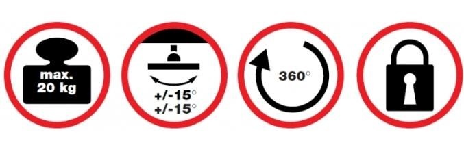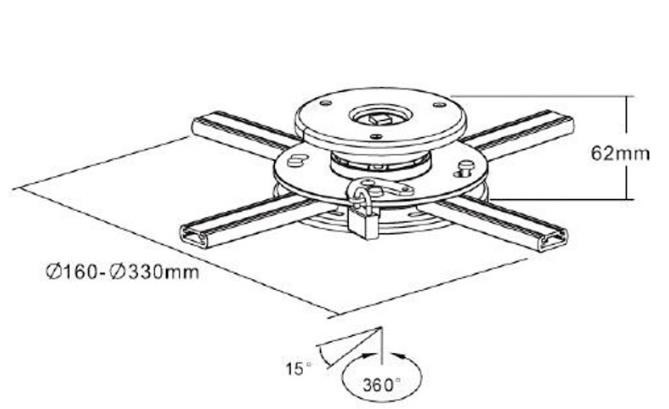 Stropní držák na dataprojektory - vzdálenost od stropu 6,2cm, přístroj lze otočit o 360° a naklonit +/-15°, maximální zatížení 20kg, možnost uzamčení proti odcizení, černý / stříbrný. Univerzální systém uchycení dataprojektorů (rozsah 16-33 cm)..