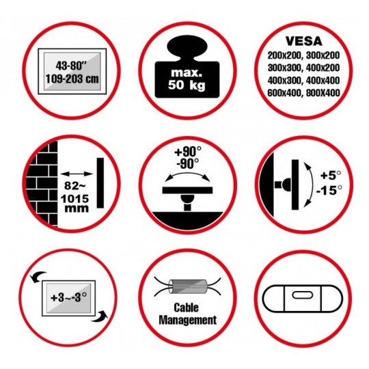 Nástěnný ocelový XL držák s bočním natáčením na LCD TV s uhlopříčkou 43"- 80" (109-203cm) a hmotností maximálně 50kg. 3x pant, vertikálně výklopný +5°/-15° a horizontálně otočný +90°/-90°, vzdálenost od stěny 82-1015mm, vodováha, Cable Managment, materiál ocel, barva černá. Uchycení VESA: 200x200, 300x200, 400x200, 300x300, 400x300, 400x400, 600x400, 800x400..